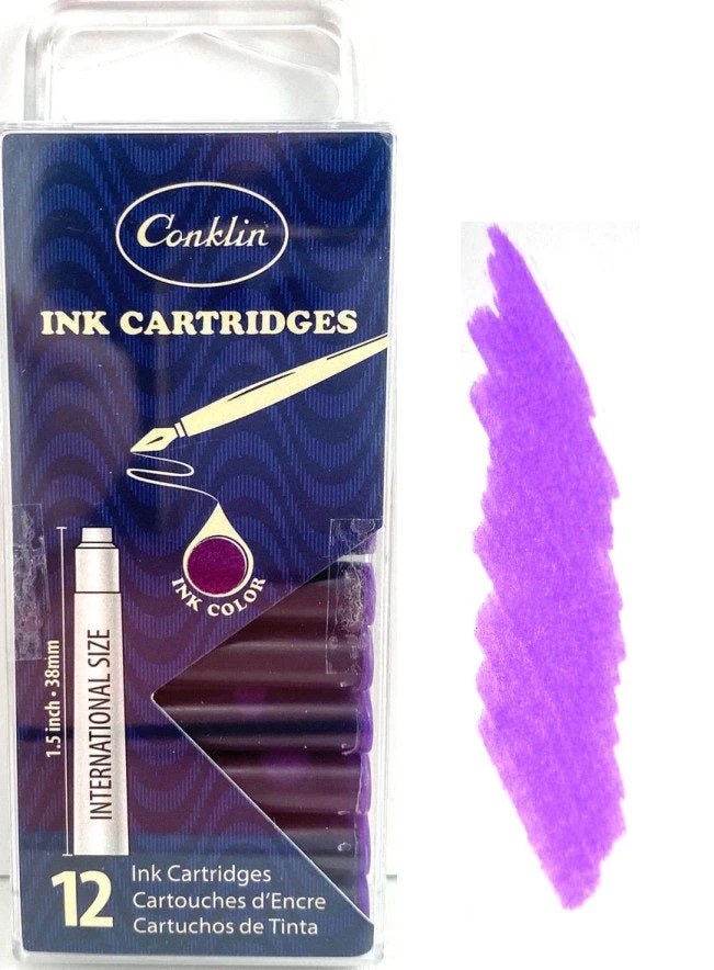 12 Conklin fountain pen ink cartridges that will fit any Conklin pen that utilizes a cartridge filling system.