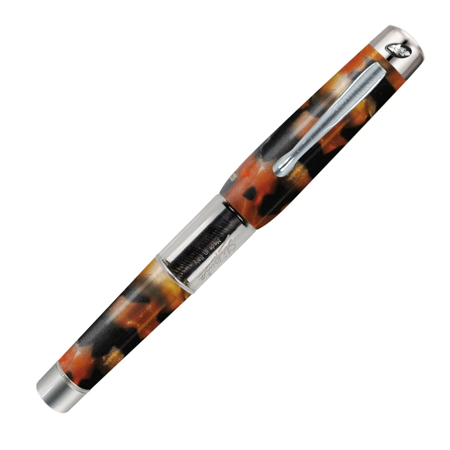 Stipula 22 is a wonderful pen made in acrylic resin turned by hand in different colors. This pen is made of brown, gold and black with a hint of some red. As with all resins, colors and patterns will vary.